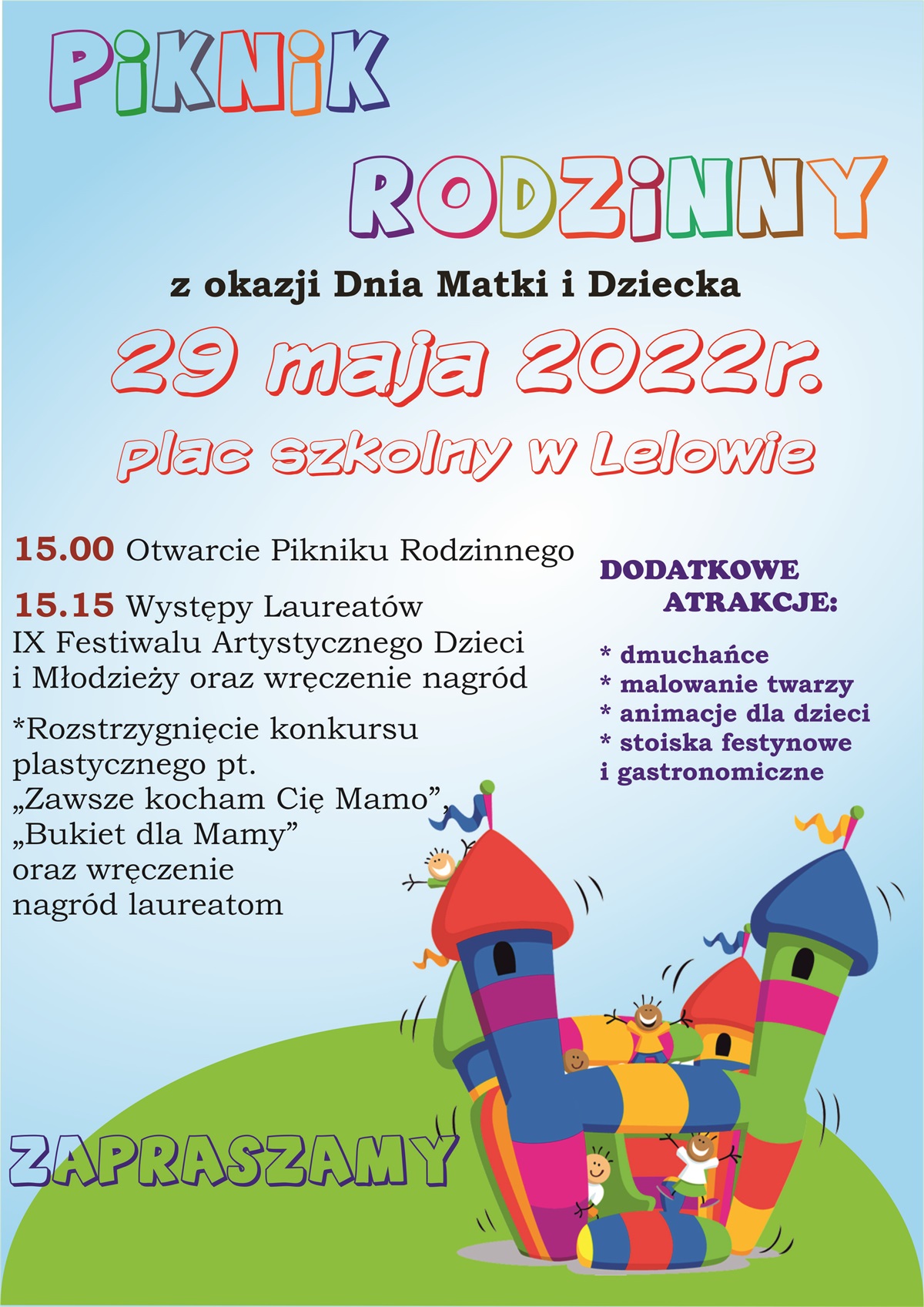 Serdecznie zapraszamy na tegoroczny Piknik Rodzinny, który odbędzie się 29 maja, na placu szkolnym w Lelowie.